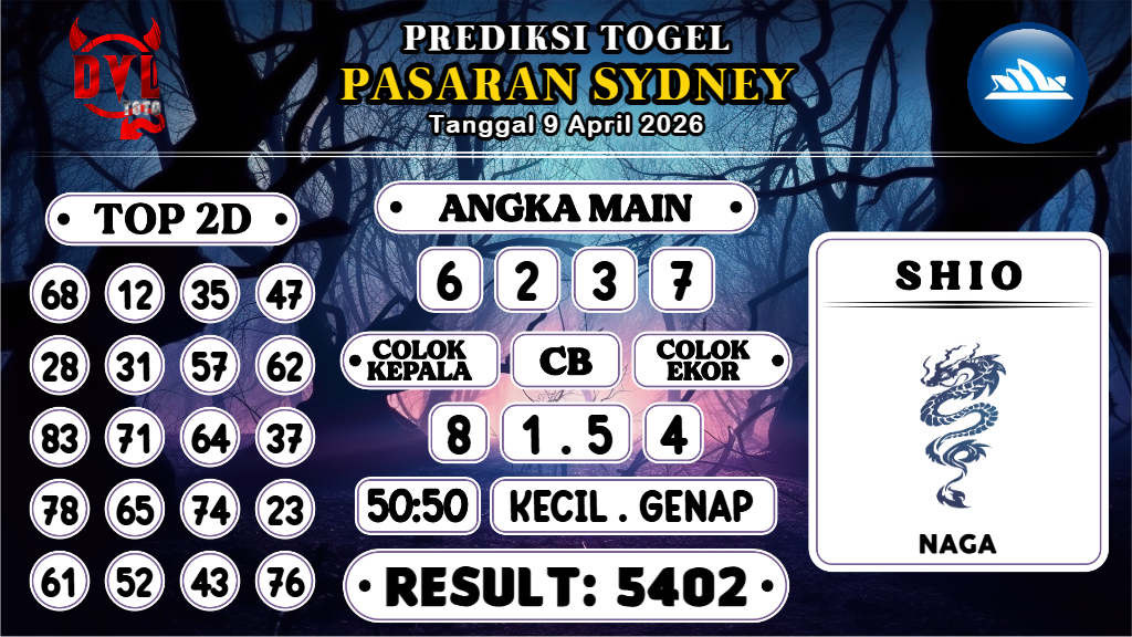 Prediksi yang bagus dan jitu harus dimainkan hanya pada Bandar Togel Terpercaya. Mengapa? Karena banyak sekali Bandar Togel Online di luar sana yang tidak bertanggungjawab atau biasa disebut Bandar Rampok. Untuk itu Kami Bocoran Mbah sangat merekomendasikan Agen Togel Online DVLTOTO yang sudah sangat terpercaya sejak 2015 dan sudah ribuan member berhasil withdraw dengan nominal Ratusan juta setiap harinya. Demikianlah Prediksi Sydney Hari Ini Kamis 9 April 2026