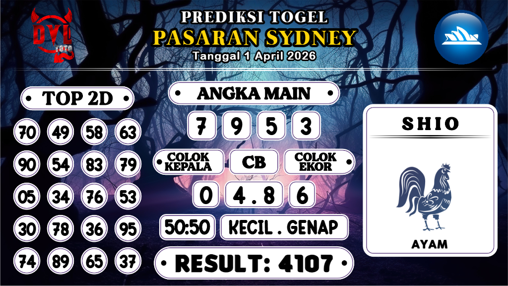 Prediksi yang bagus dan jitu harus dimainkan hanya pada Bandar Togel Terpercaya. Mengapa? Karena banyak sekali Bandar Togel Online di luar sana yang tidak bertanggungjawab atau biasa disebut Bandar Rampok. Untuk itu Kami Bocoran Mbah sangat merekomendasikan Agen Togel Online DVLTOTO yang sudah sangat terpercaya sejak 2015 dan sudah ribuan member berhasil withdraw dengan nominal Ratusan juta setiap harinya. Demikianlah Prediksi Sydney Hari Ini Rabu 1 April 2026