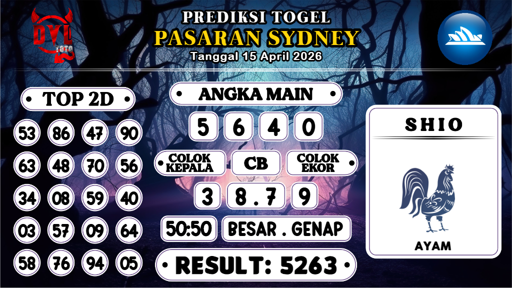 Prediksi yang bagus dan jitu harus dimainkan hanya pada Bandar Togel Terpercaya. Mengapa? Karena banyak sekali Bandar Togel Online di luar sana yang tidak bertanggungjawab atau biasa disebut Bandar Rampok. Untuk itu Kami Bocoran Mbah sangat merekomendasikan Agen Togel Online DVLTOTO yang sudah sangat terpercaya sejak 2015 dan sudah ribuan member berhasil withdraw dengan nominal Ratusan juta setiap harinya. Demikianlah Prediksi Sydney Hari Ini Rabu 15 April 2026