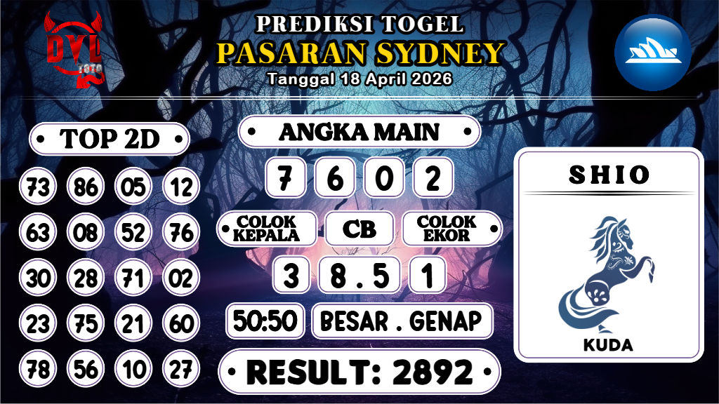 Prediksi yang bagus dan jitu harus dimainkan hanya pada Bandar Togel Terpercaya. Mengapa? Karena banyak sekali Bandar Togel Online di luar sana yang tidak bertanggungjawab atau biasa disebut Bandar Rampok. Untuk itu Kami Bocoran Mbah sangat merekomendasikan Agen Togel Online DVLTOTO yang sudah sangat terpercaya sejak 2015 dan sudah ribuan member berhasil withdraw dengan nominal Ratusan juta setiap harinya. Demikianlah Prediksi Sydney Hari Ini Sabtu 18 April 2026