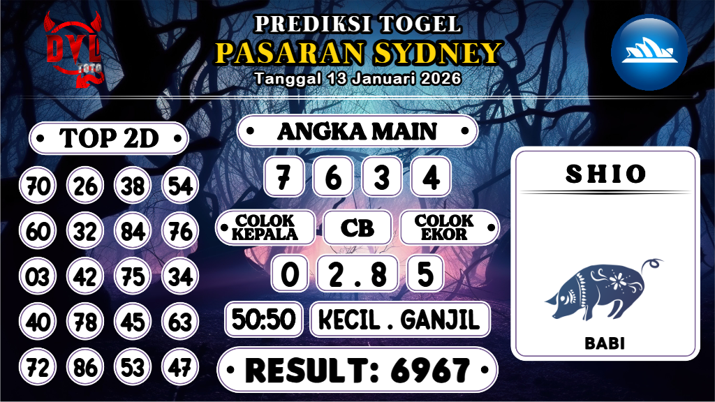 Prediksi yang bagus dan jitu harus dimainkan hanya pada Bandar Togel Terpercaya. Mengapa? Karena banyak sekali Bandar Togel Online di luar sana yang tidak bertanggungjawab atau biasa disebut Bandar Rampok. Untuk itu Kami Bocoran Mbah sangat merekomendasikan Agen Togel Online DVLTOTO yang sudah sangat terpercaya sejak 2015 dan sudah ribuan member berhasil withdraw dengan nominal Ratusan juta setiap harinya. Demikianlah Prediksi Sydney Hari Ini Selasa 13 Januari 2026 yang di berikan di atas. Salam Jackpot!