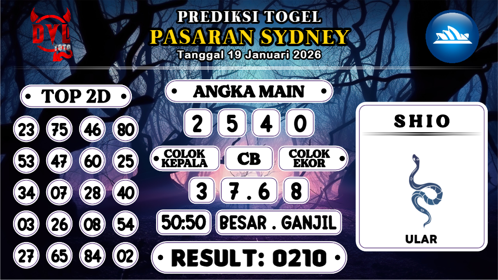 Prediksi yang bagus dan jitu harus dimainkan hanya pada Bandar Togel Terpercaya. Mengapa? Karena banyak sekali Bandar Togel Online di luar sana yang tidak bertanggungjawab atau biasa disebut Bandar Rampok. Untuk itu Kami Bocoran Mbah sangat merekomendasikan Agen Togel Online DVLTOTO yang sudah sangat terpercaya sejak 2015 dan sudah ribuan member berhasil withdraw dengan nominal Ratusan juta setiap harinya. Demikianlah Prediksi Sydney Hari Ini Senin 19 Januari 2026 yang di berikan di atas. Salam Jackpot!