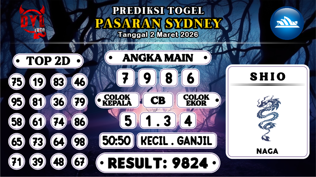 Prediksi yang bagus dan jitu harus dimainkan hanya pada Bandar Togel Terpercaya. Mengapa? Karena banyak sekali Bandar Togel Online di luar sana yang tidak bertanggungjawab atau biasa disebut Bandar Rampok. Untuk itu Kami Bocoran Mbah sangat merekomendasikan Agen Togel Online DVLTOTO yang sudah sangat terpercaya sejak 2015 dan sudah ribuan member berhasil withdraw dengan nominal Ratusan juta setiap harinya. Demikianlah Prediksi Sydney Hari Ini Senin 2 Maret 2026